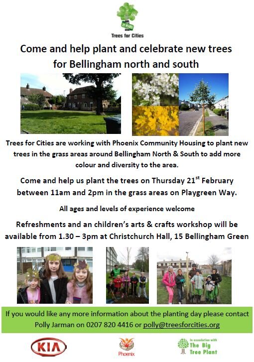 Trees for Cities and Phoenix Community Housing are planting new trees in the grass areas around Bellingham North and South. You can help plant the trees on Thursday 21st February between 11am and 2pm in the grass area on Playgreen Way